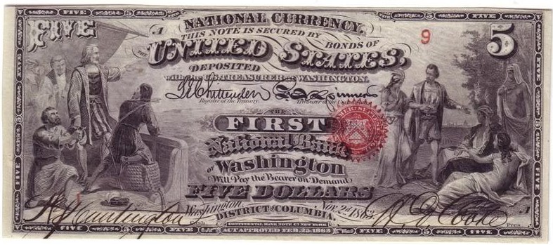 Original series $5 Washington, DC Ch26 W.S. Huntington, Cashier and H.D. Cooke, President. This was the first national bank note issued and carries SN 1 and a red Treasury SN 9.