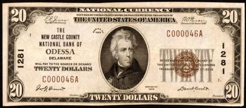 1929 Type 1 $20 Odessa, DE Ch1281 Joseph G. Brown, Cashier and Daniel Corbit, President