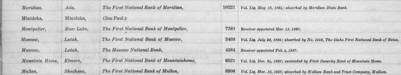 Excerpt from Alphabetical List of National Banks by States, Active and Closed--1941," Comptroller of the Currency, p. 58. Bank entered voluntary liquidation on July 22, 1936 Moscow, ID Ch3408
