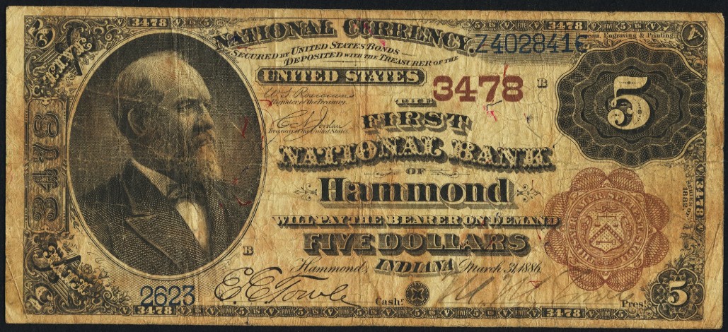 1882 Brown Back $5 Hammond, IN Ch3478 E.E. Towle, Cashier and M.M. Towle, President