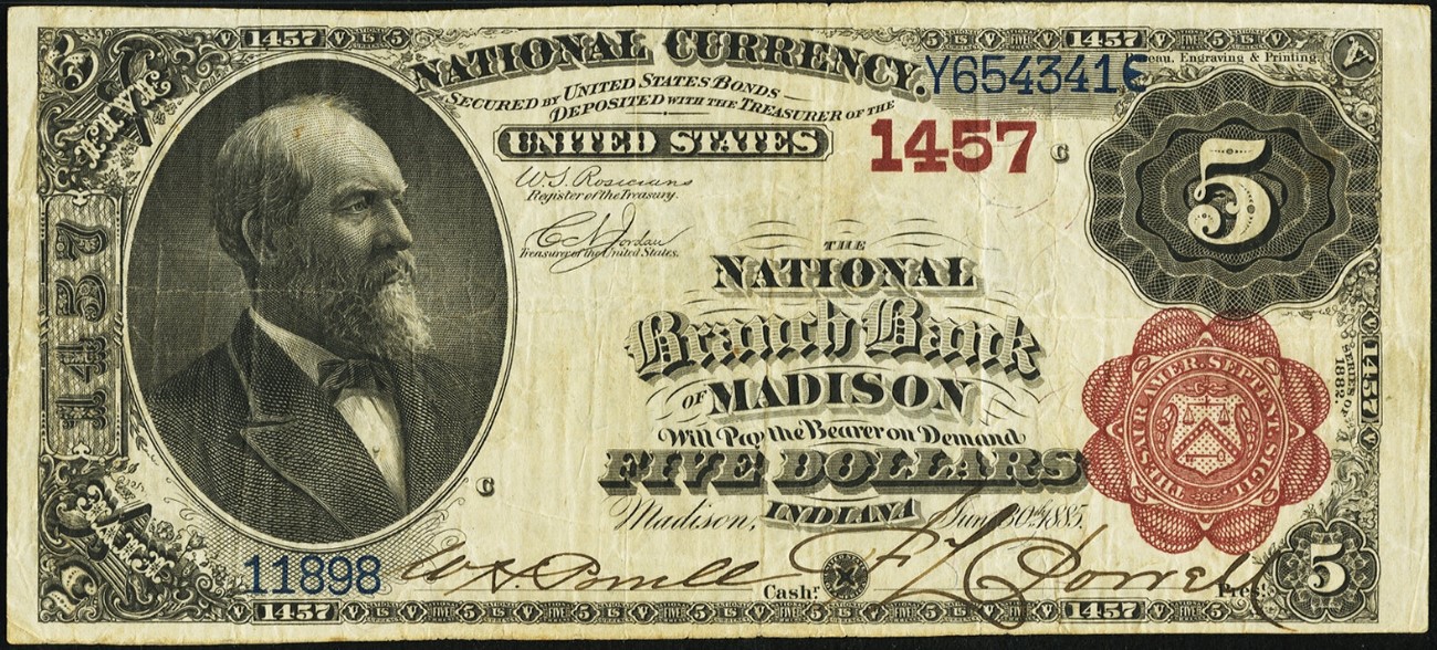 1882 Brown Back $5 Madison, IN Ch1457 W.H. Powell, Cashier and F.L. Powell, President
