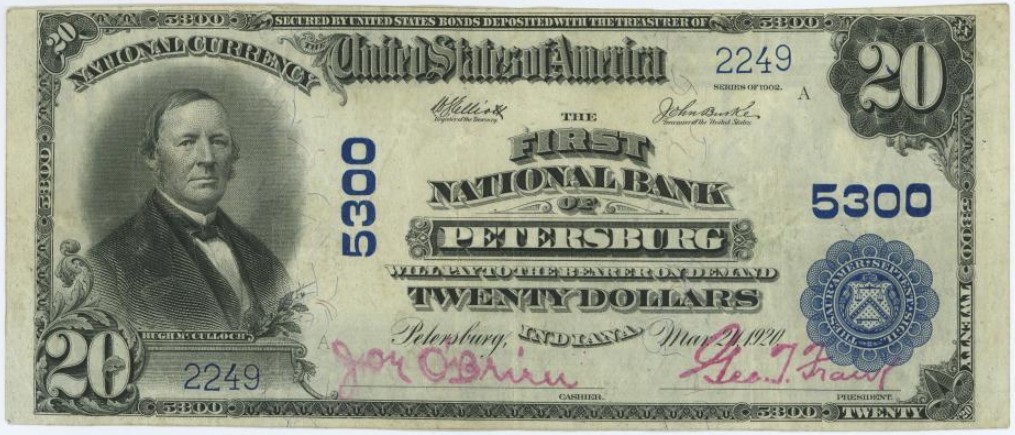 1902 Plain Back $20 Petersburg, IN Ch5300 J.P. O'Brien, Cashier and George T. Frank, President