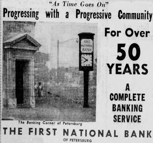An August 1955 advertisement for the First National Bank of Petersburg, IN Ch5300