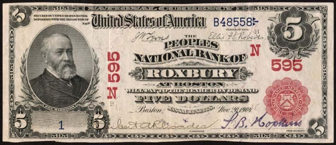 1902 Red Seal $5 Roxbury, MA Ch595 Herbert A. Rhoades, Cashier and S.B. Hopkins, President