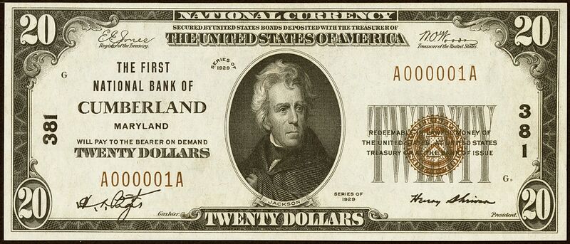 1929 Type 1 $20 Cumberland, MD Ch381 SN 1 H.A. Pitzer, Cashier and Henry Shriver, President