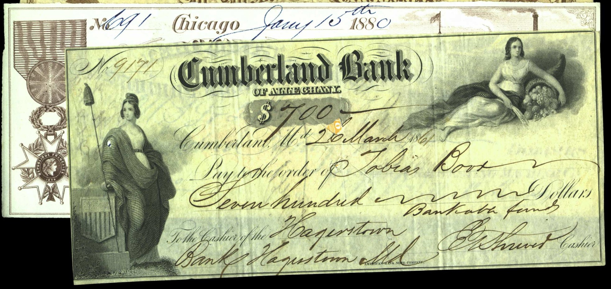 Check from the Cumberland Bank of Alleghany dated March 26, 1861 signed by E.T. Shriver, Cashier MD Ch381