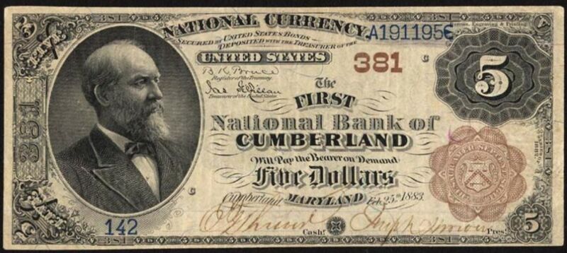 1882 Brown Back $5 Cumberland, MD Ch381 E.T. Shriver, Cashier and Joseph Shriver, President