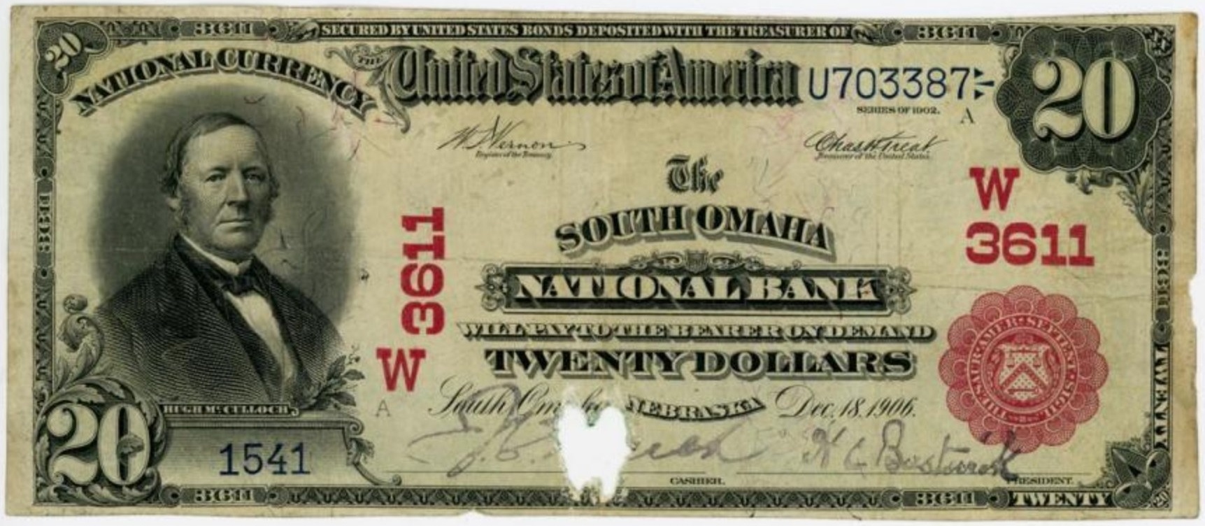 1902 Red Seal $20 South Omaha, NE Ch3611 J.C. French, Cashier and H.C. Bostwick, President