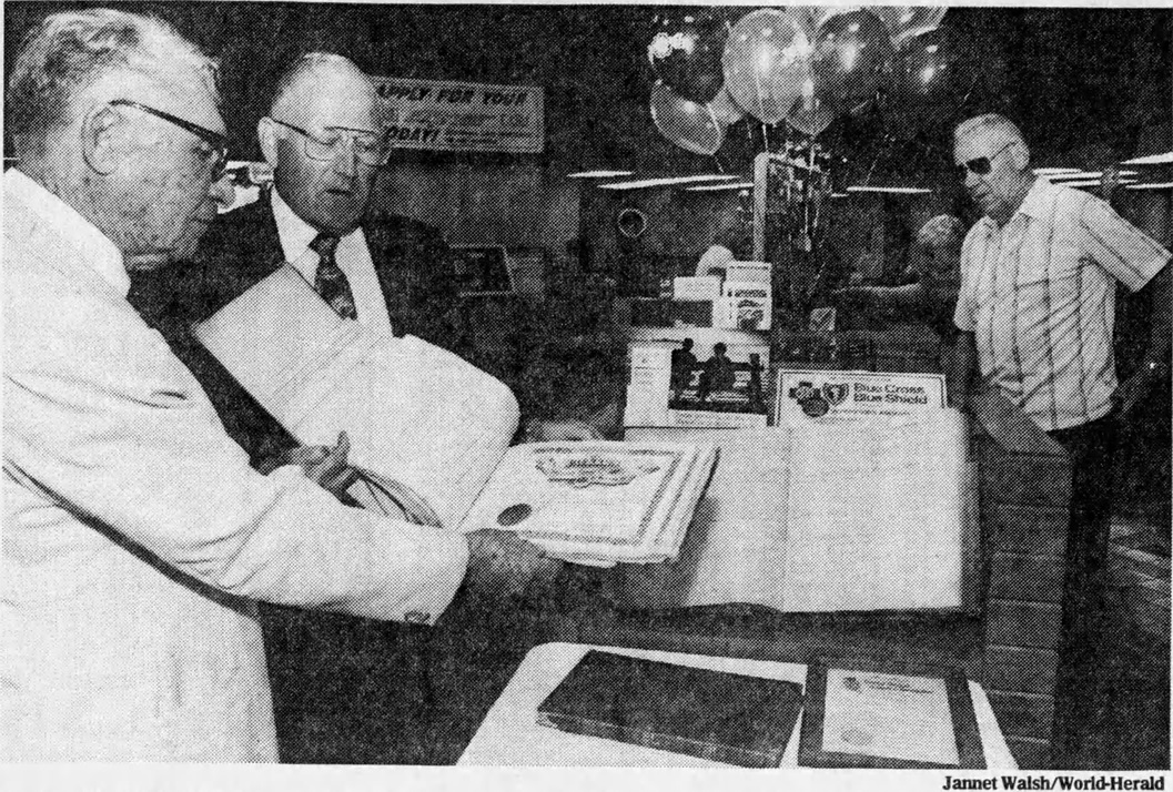 Photo from 1991 of Packers Bank's Laddie Kozeny, chairman emeritus of the bank, (left) and Edward Kohout look at the bank's original capital stock documents as 30-year customer Al Spicl prepares to do some banking. The South Omaha branch of the Nebraska Savings Bank reorganized on July 16, 1891, and became Packers National Bank. It had $100,000 in starting capital and an office at 2529 N St., about four blocks from its location at 4710 S. 23rd Street, South Omaha, NE Ch4589