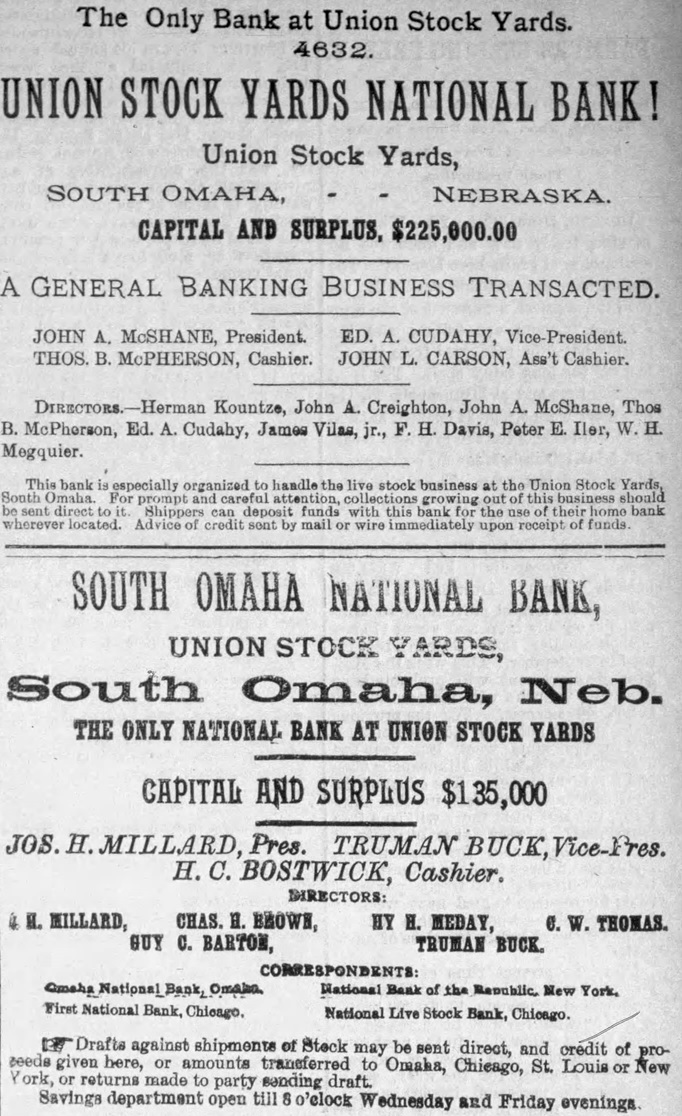 Ads for the new Union Stock Yards National Bank Ch4632 and South Omaha National Bank Ch3611 October 1891 the banks consolidate in 1911 to form the Stock Yards National Bank NE Ch9908