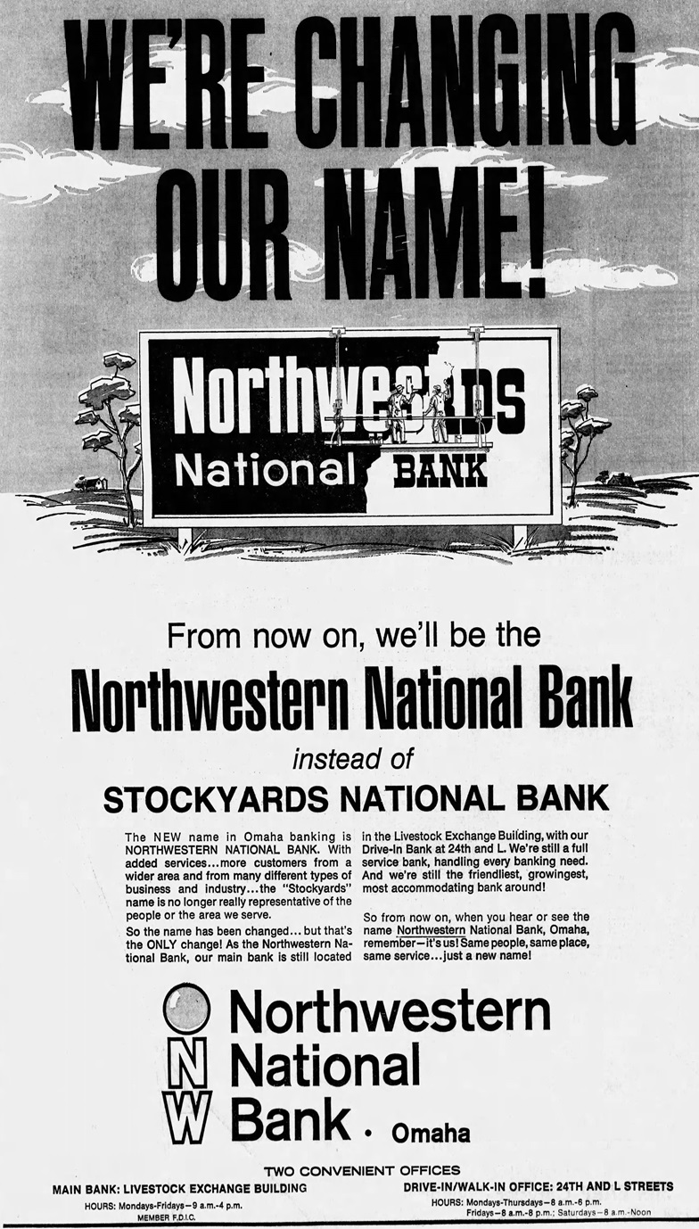 Advertisement from August 1970 for Northwestern National Bank, the new name of Omaha's Stockyards National Bank South Omaha, NE Ch9908
