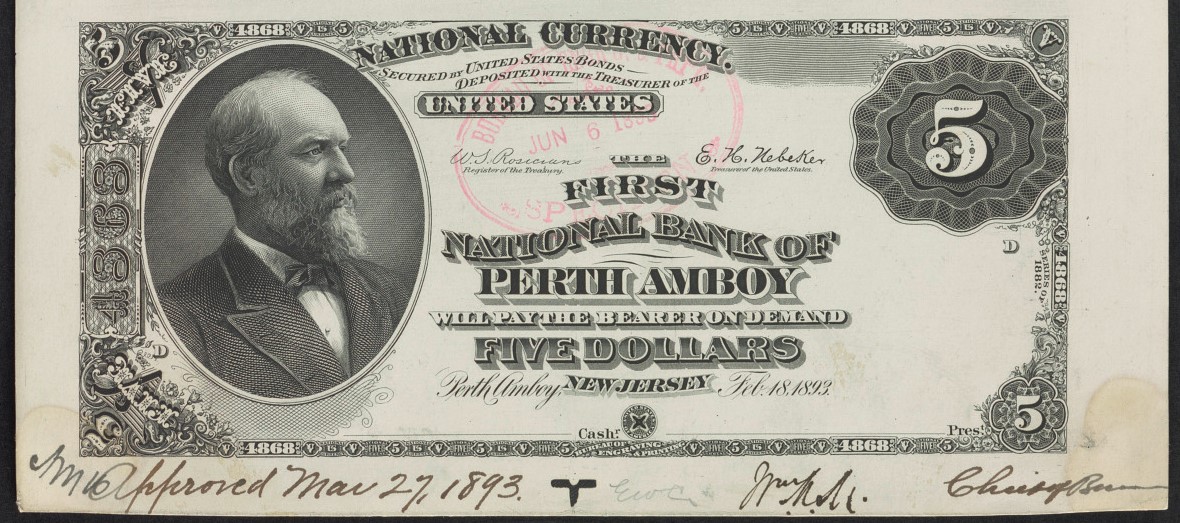 1882 Brown Back $5 proof Perth Amboy, NJ Ch4868 bank failed to organize and ch5215 FNB organized in 1899 see Huntoon chapter I03 NBN Encyclopedia