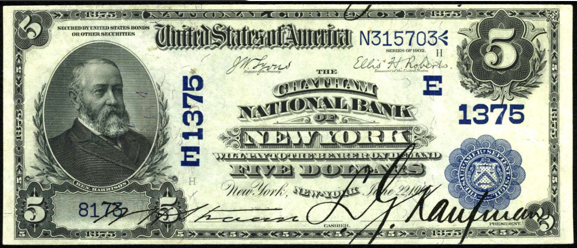 1902 Date Back $5 New York, NY Ch1375 W.H. Strawn, Cashier and L.G. Kaufman, President
