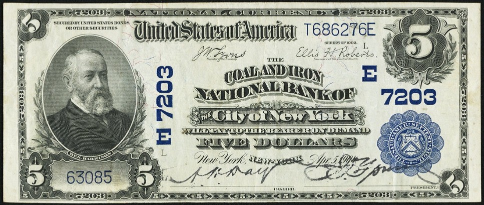 1902 Plain Back $5 New York, NY Ch7203 A.H. Day, Cashier and J.T. Sproull, President