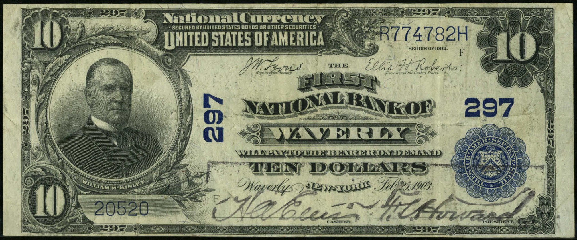 1902 Plain Back $10 Waverly, NY Ch297 H.A. Ellis, Cashier and F.L. Howard, President
