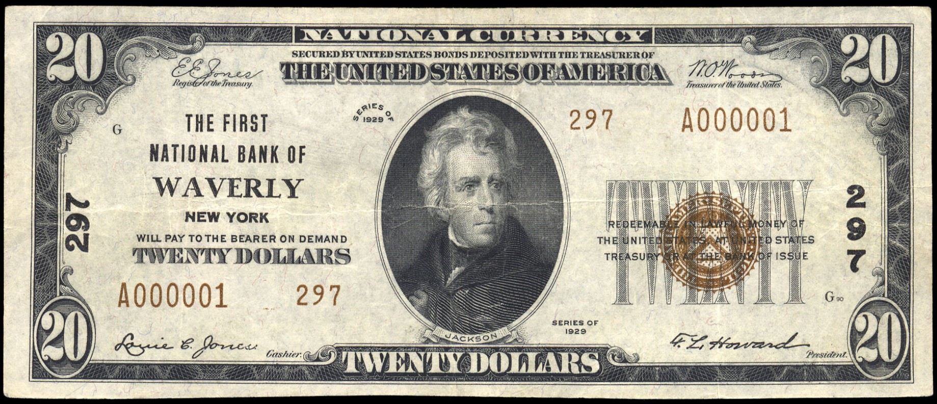 1929 Type 2 $20 Waverly, NY Ch297 Louie C. Jones, Cashier and F.L. Howard, President