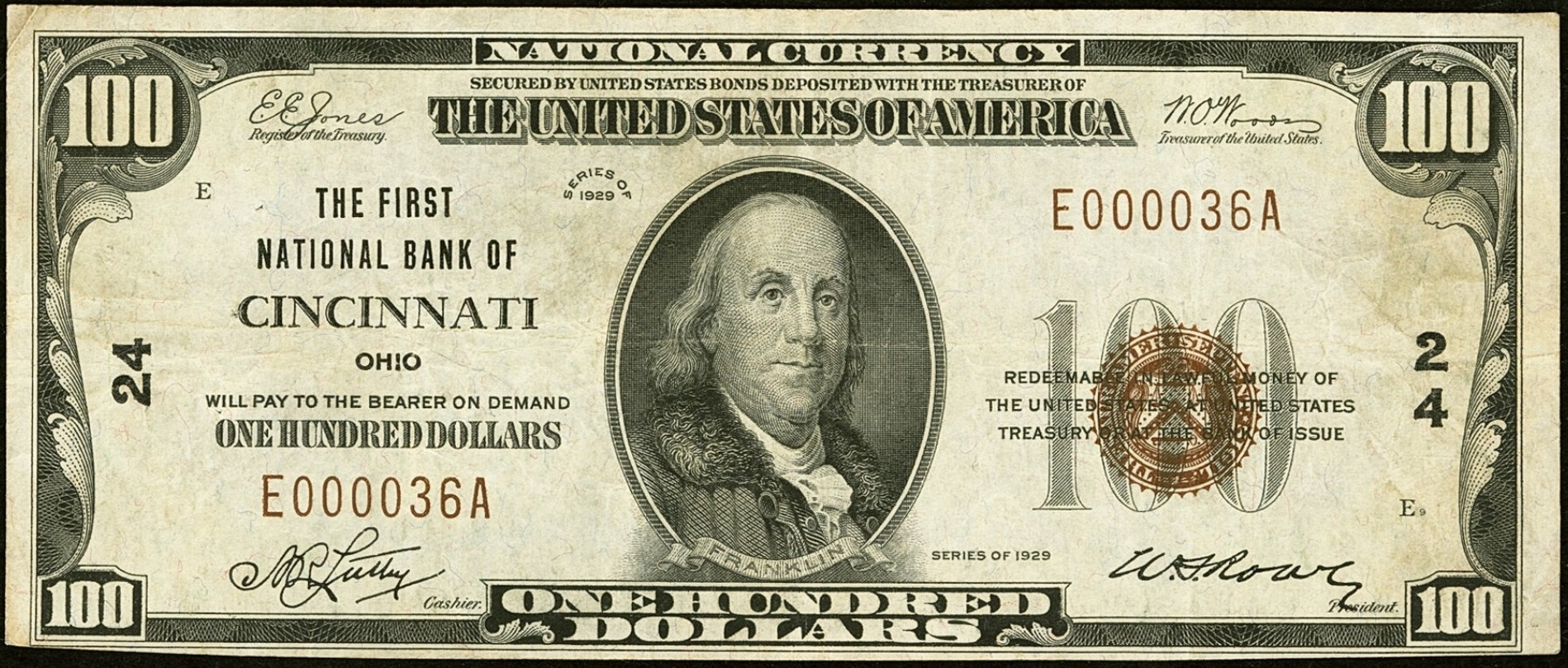 1929 Type 1 $100 Cincinnati, OH Ch24 A.R. Luthy, Cashier and W.S. Rowe, President