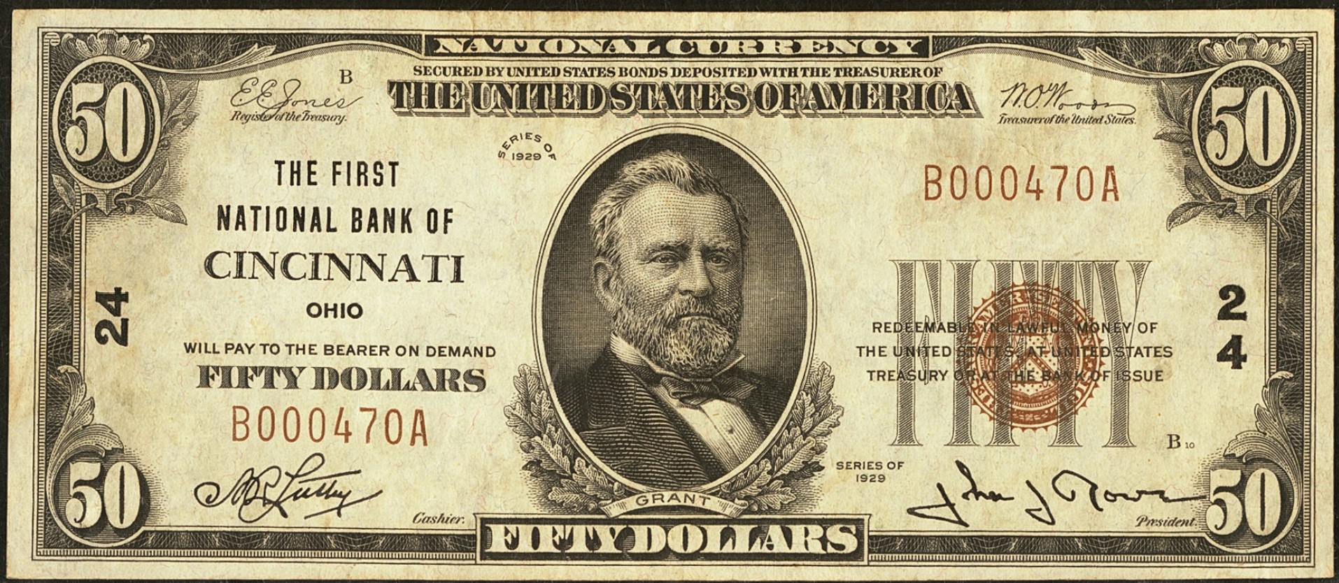 1929 Type 1 $50 Cincinnati, OH Ch24 A.R. Luthy, Cashier and John J. Rowe, President previously mounted