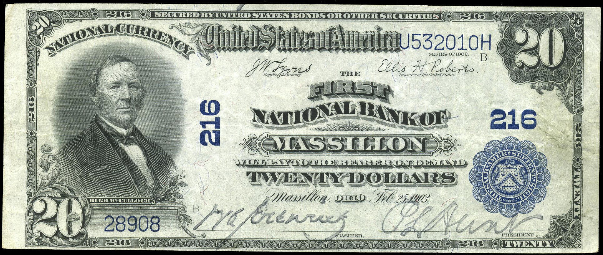 1902 Plain Back $20 Massillon, OH Ch216 W.A. Krenick, Cashier and P.L. Hunt, President