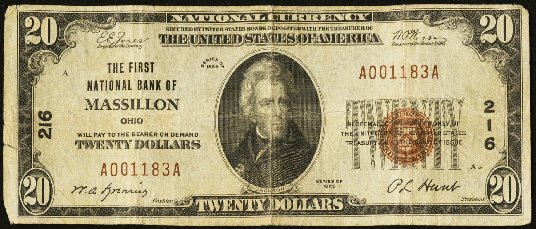 1929 Type 1 $20 Massillon, OH Ch216 W.A. Krenick, Cashier and P.L. Hunt, President Replacement