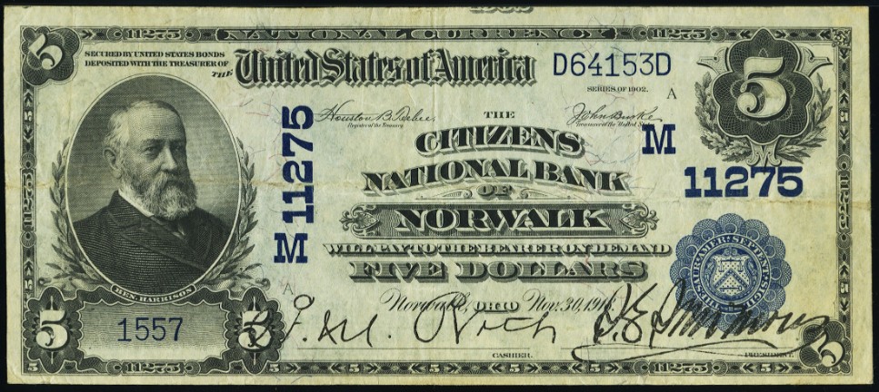 1902 Plain Back $5 Norwalk, OH Ch11275 F.M. Roth, Cashier and S.E. Simmons, President