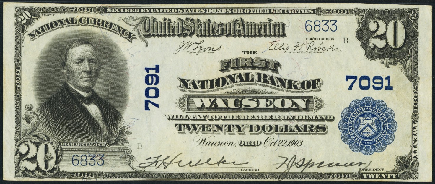 1902 Plain Back $20 Wauseon, OH Ch7091 F.H. Weber, Cashier and F.J. Spencer, Vice President