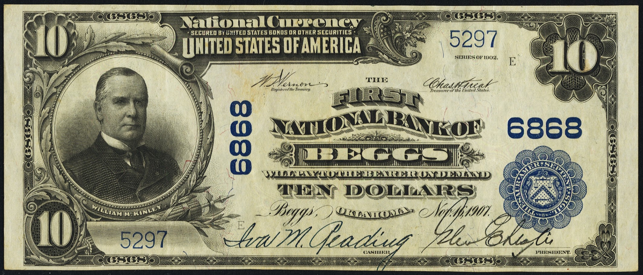 1902 Plain Back $10 Beggs, OK Ch6868 Iva M. Reading, Cashier and Glen E. Leslie, Vice President