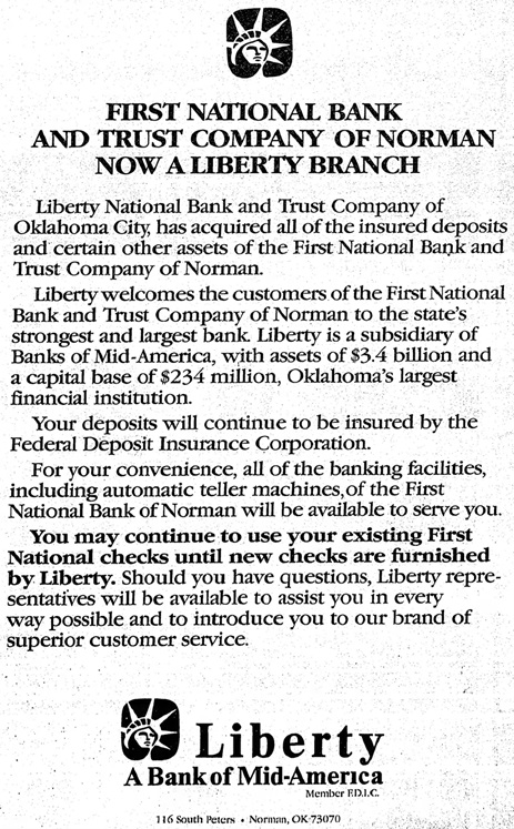 1986 Ad for the First National Bank and Trust Company of Norman acquired by the Liberty National Bank and Trust Company of Oklahoma City, May 30, 1986. The Norman branch was located at 116 South Peters, Norman, OK. Liberty was a subsidiary f Banks of Mid-America with assets of $3.4 billion and capital of $234 million, Oklahoma's largest financial institution Ch11230