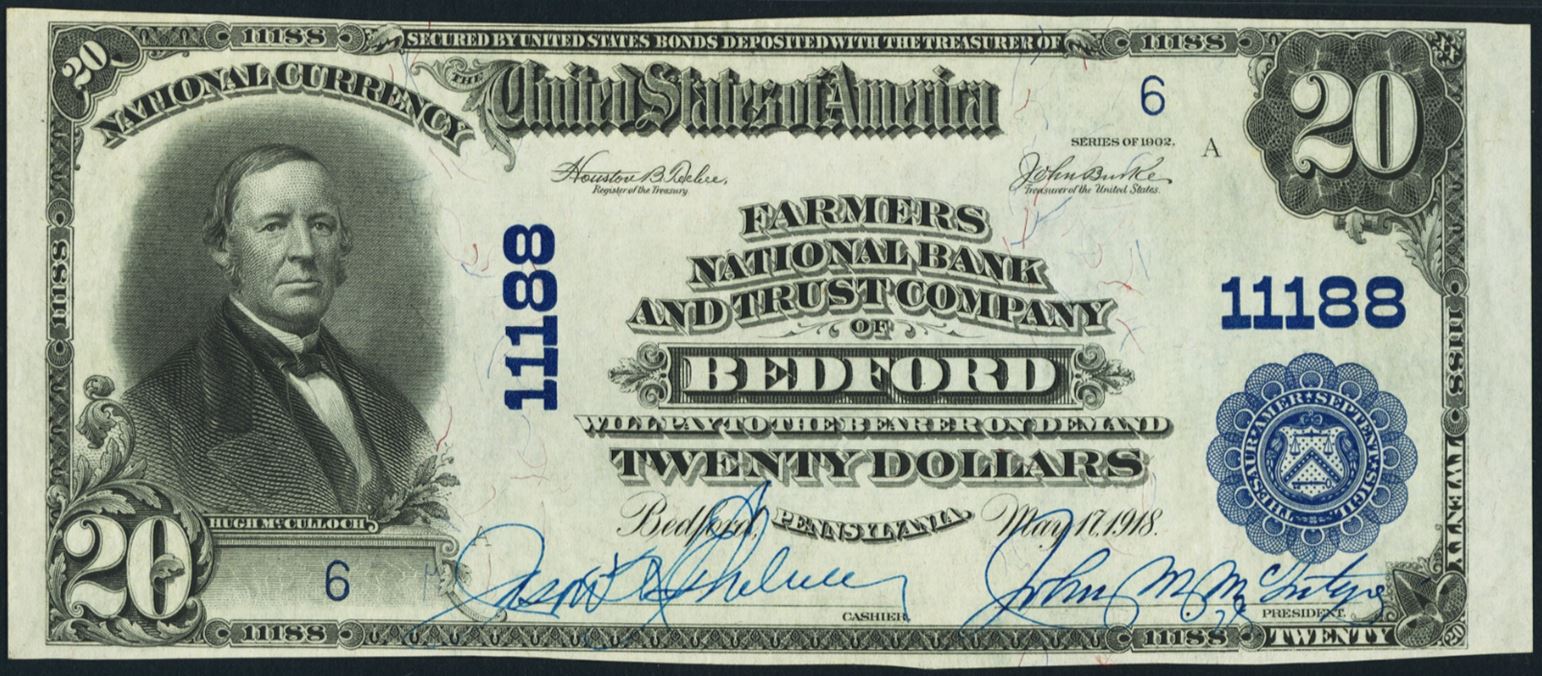 1902 Plain Back $20 Bedford, PA Ch11188 Third Title Jason H. Eshelman, Cashier and John M. McIntyre, Vice President