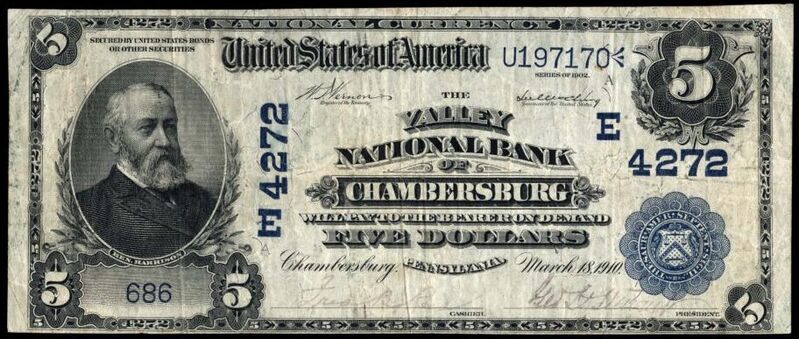 1902 Date Back $5 Radar SN Chambersburg, PA Ch4272 Fred. B. Reed, Cashier and George H. Stewart, President