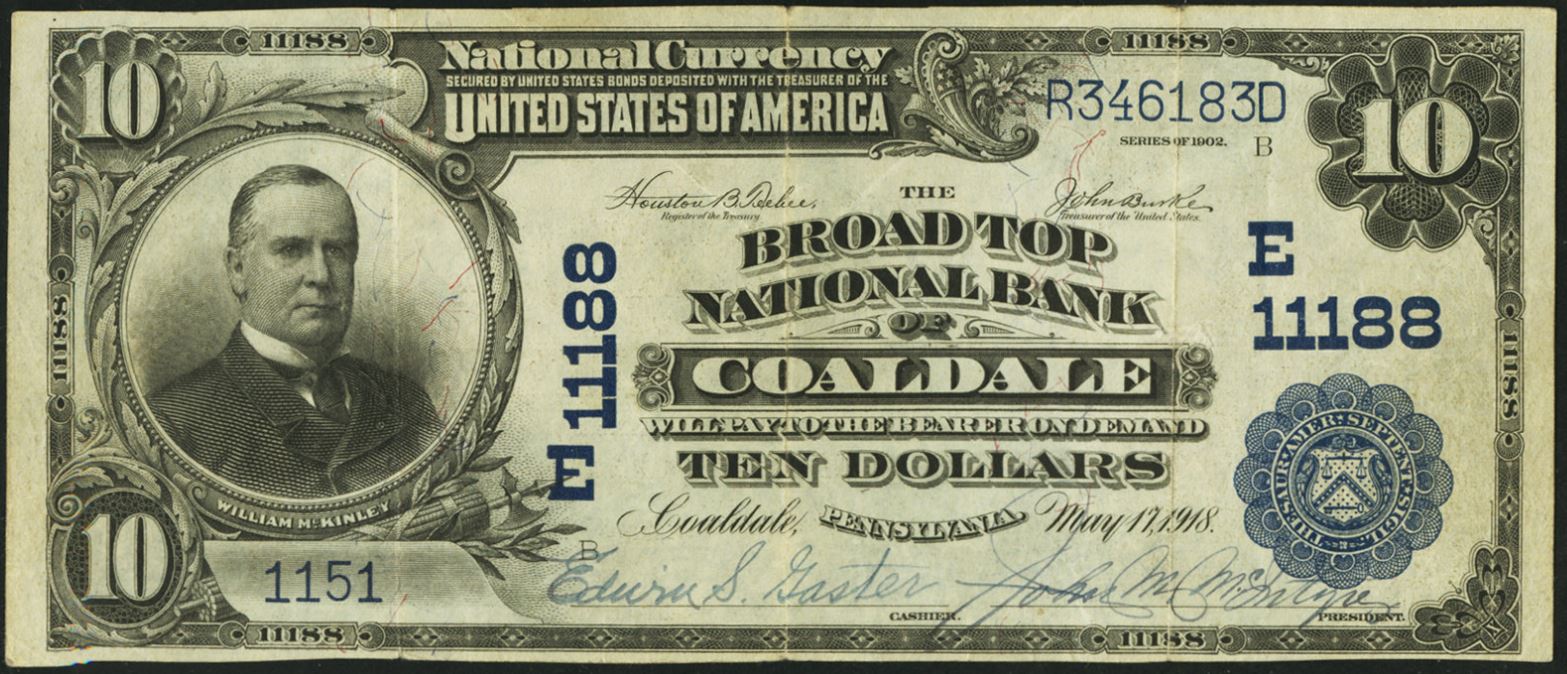 1902 Plain Back $10 Coaldale, PA Ch11188 Edwin S. Gaster, Cashier and John M. McIntyre, President
