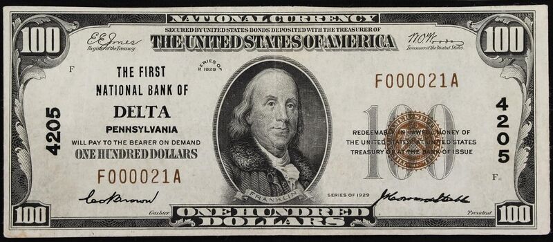 1929 Type 1 $100 Delta, PA Ch4205 C.O. Brown, Cashier and J. Howard Stubbs, President