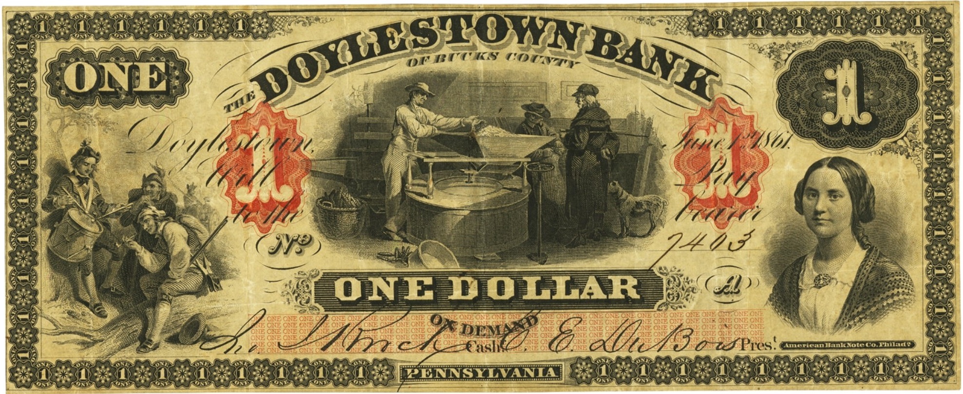 The Doylestown Bank of Bucks County Obsolete $1, Haxby PA-105, with SN 7403A and signatures of J.J. Brock, Cashier and C.E. DuBois, President, dated June 1, 1861. Engraved and printed by the American Bank Note Company, this note's central vignette described by Durand as "The Mill" in Interesting Notes About Vignettes, shows three men and a dog around a mill stone. At the left is a group of Continental minutemen. At the right is a portrait of a woman wearing a brooch. Vermillion signature block guilloche and dies flank the vignette with outlined "1" protectors in white PA Ch573