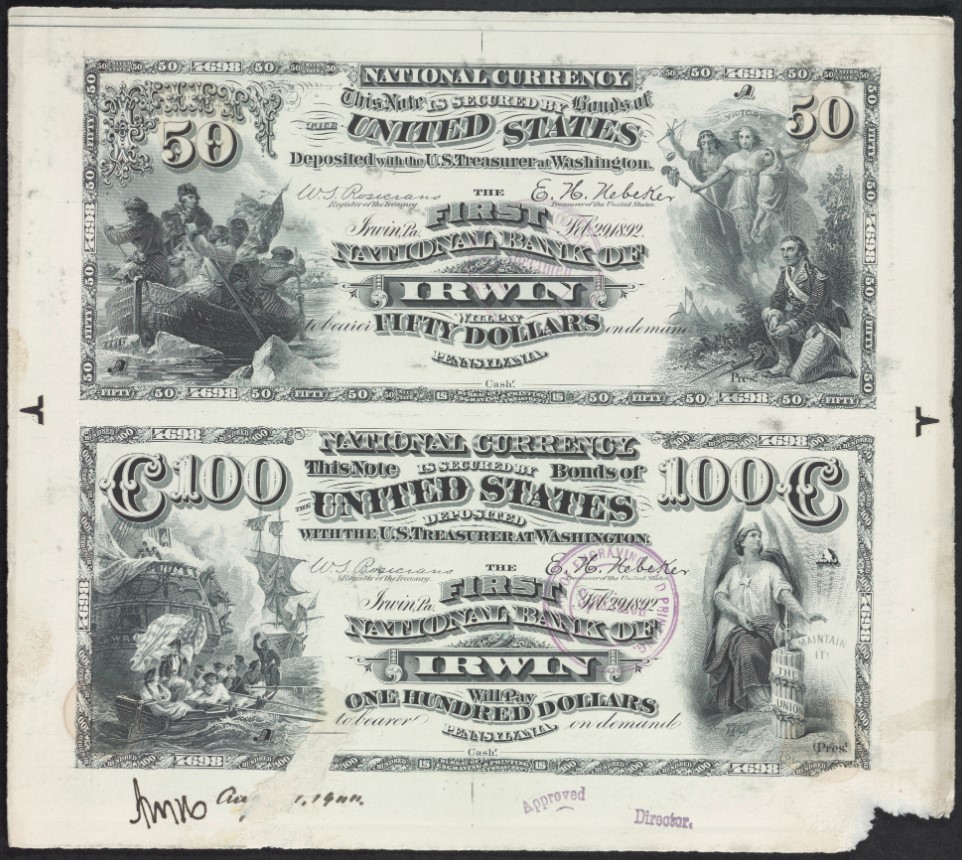 1882 Brown Back $50-$100 proof sheet approved in August 1900 Irwin, PA Ch4698 plate date Feb 29, 1892