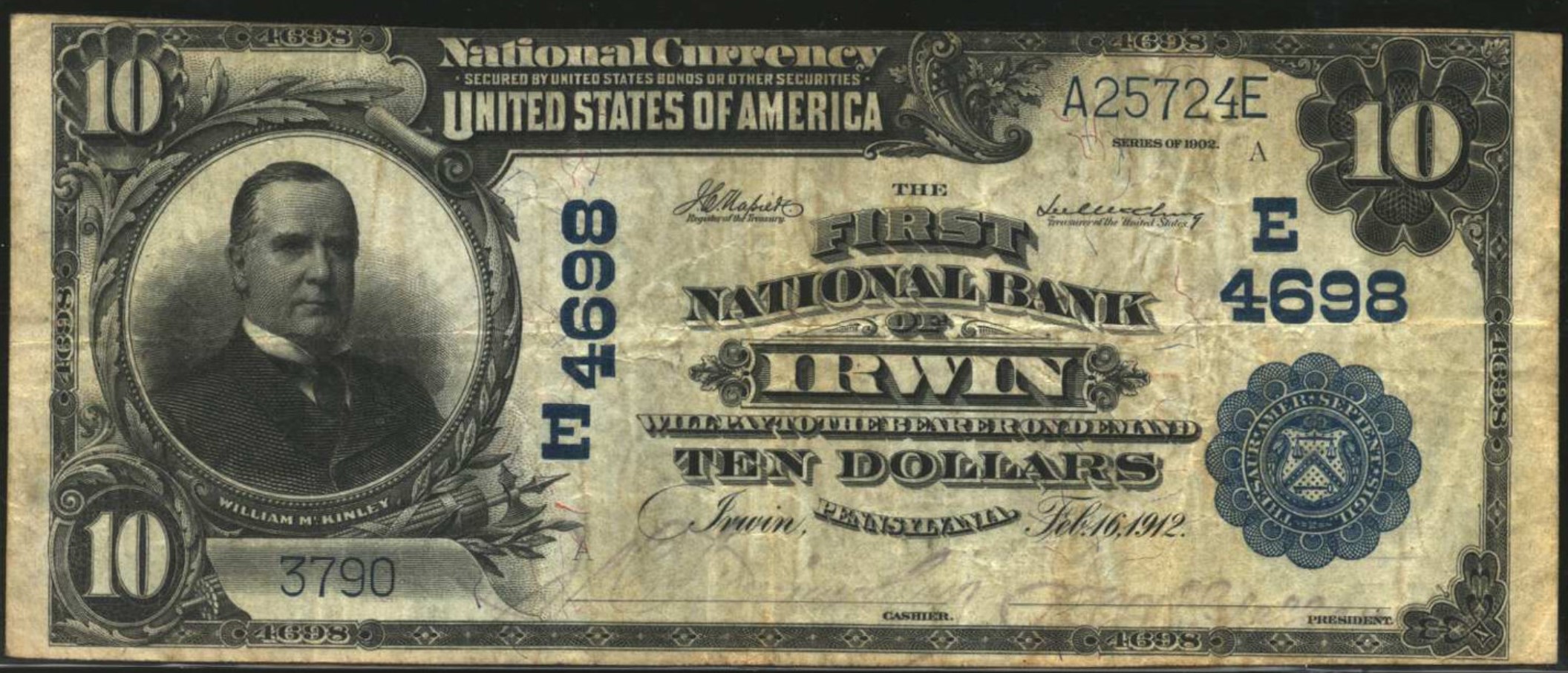 1902 Plain Back $10 Irwin J.B. Cunningham, Cashier and R.P. McClellan, President