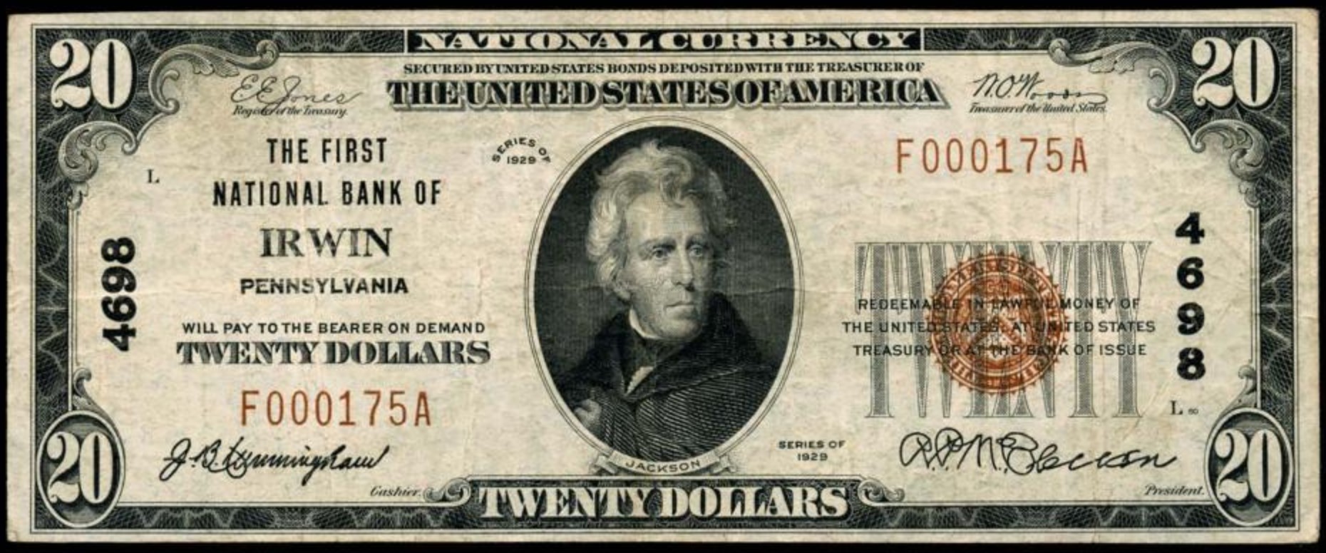 1929 Type 1 $20 Irwin, PA Ch4698 J.B. Cunningham, Cashier and R.P. McClellan, President