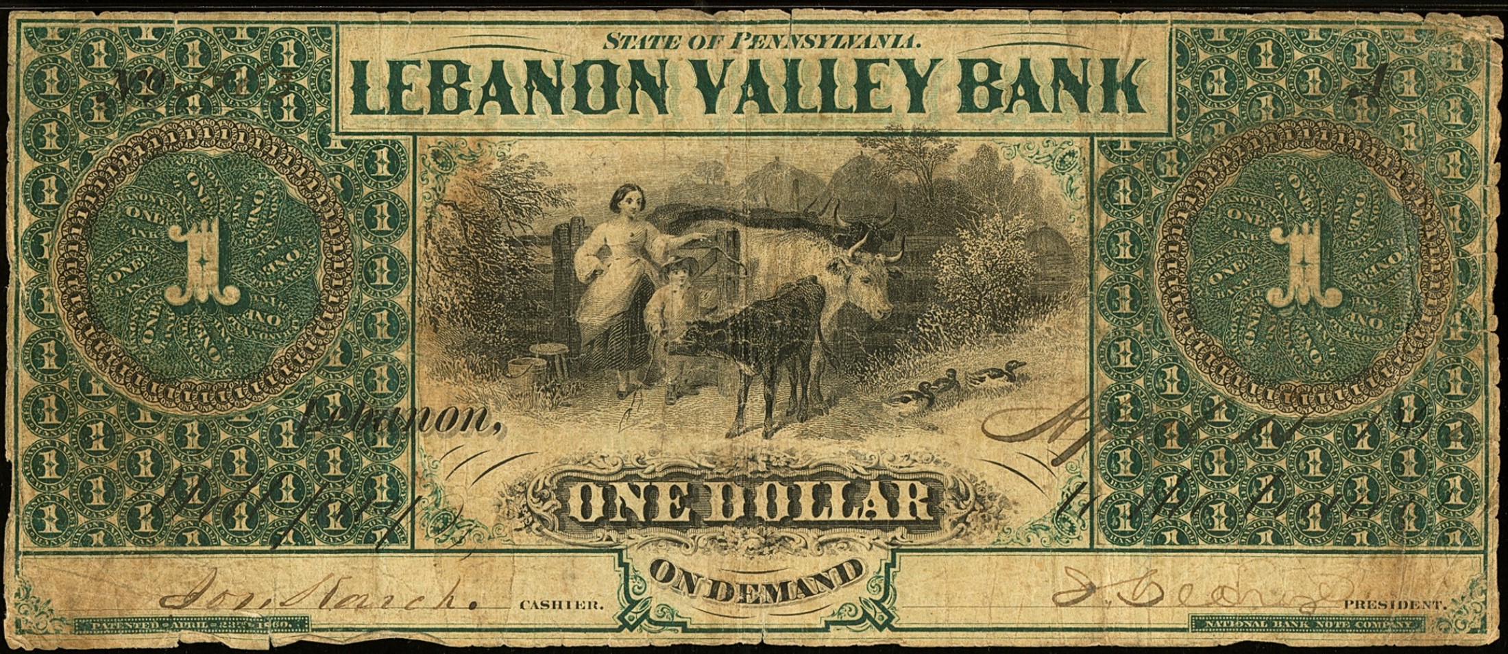 Lebanon Valley Bank Obsolete $1, Haxby PA-235, signed by George Karch, Cashier and John George, President. Printed by National Bank Note Company, this unusual design has just one vignette, that of a farm wife and child herding cattle through a gate, flanked by two massive green panels PA Ch655