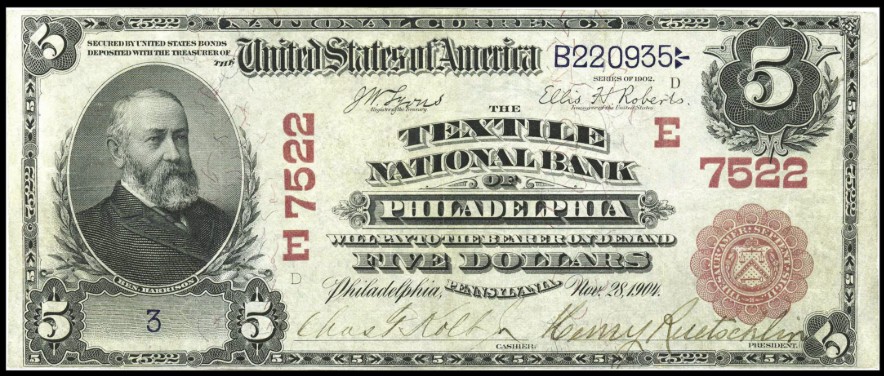 1902 Red Seal $5 Philadelphia, PA Ch7522 SN 3D Replacement Charles F. Kolb, Jr., and Henry Ruetschlin, President