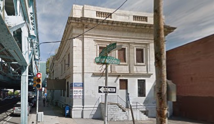 Side view of the old Textile National Bank Philadelphia, PA Ch7522 next to the elevated rail, corner of Kensington Ave. and Huntingdon St. ca2011