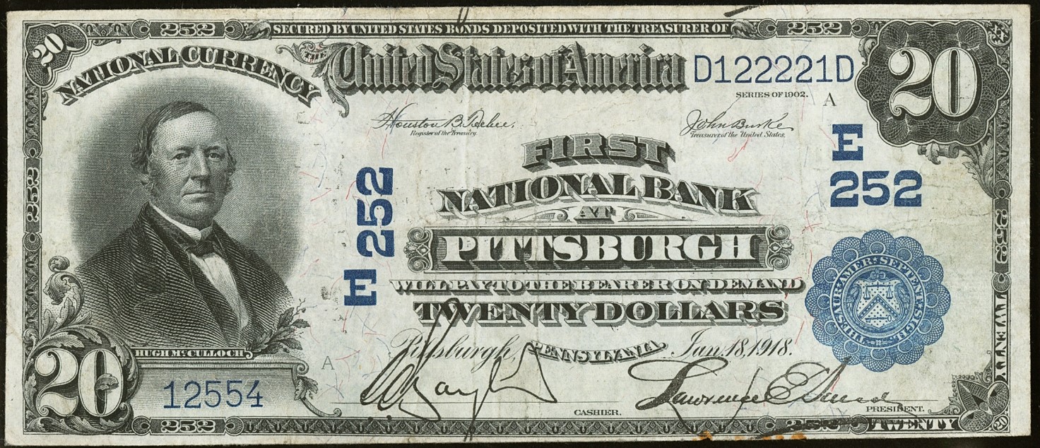1902 Plain Back $20 Pittsburgh, PA Ch252 C.C. Taylor, Cashier and Lawrence E. Sands, President Radar Treasury SN.