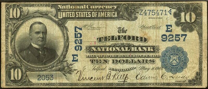 1902 Date Back $10 Telford, PA Ch9257 Vincent B. Kulp, Cashier and Edwin C. Leidy, President