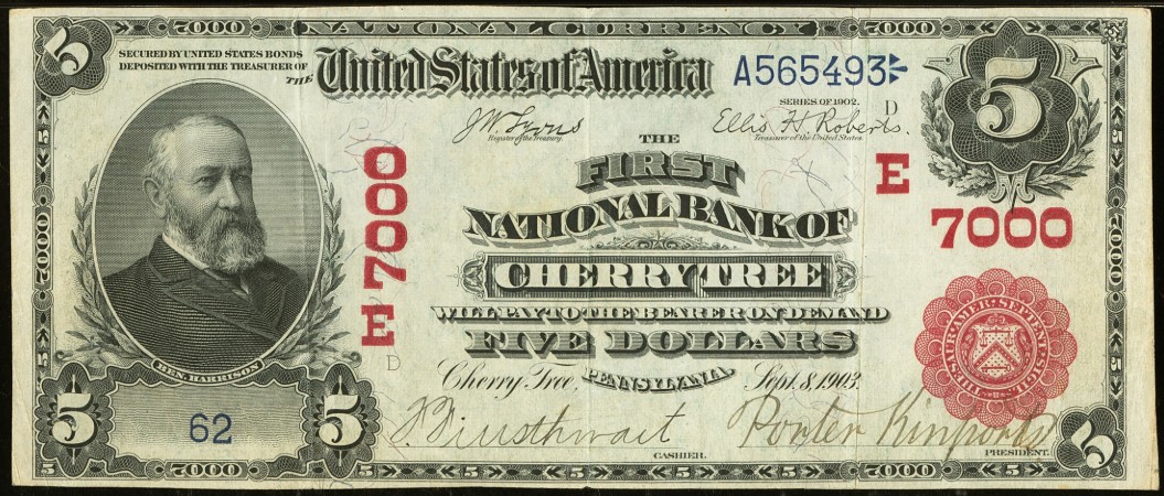 1902 Red Seal $5 Cherry Tree, PA Ch7000 Frank Finsthwait, Cashier and Porter Kinports, President