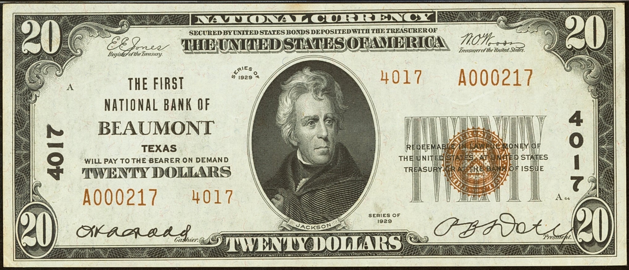 1929 Type 2 $20 Beaumont, TX Ch4017 H.A. Dodd, Cashier and P.B. Doty, President