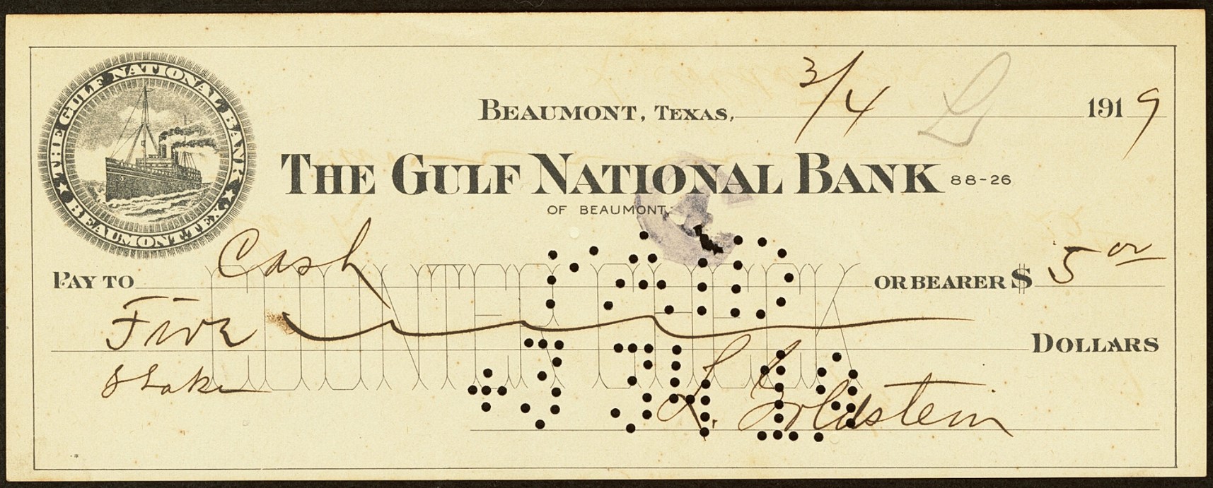 Check dated March 4, 1919, drawn on the Gulf National Bank of Beaumont TX Ch6338 with logo