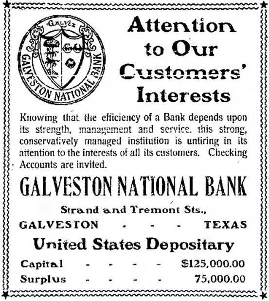Advertisement from April 1909 for the Galveston National Bank located at Strand and Tremont Streets TX Ch4153