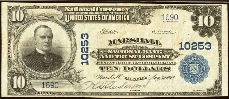 1902 Plain Back $10 Marshall, VA Ch10253 P.W. Anderson, Cashier and J.T. Ramey, President