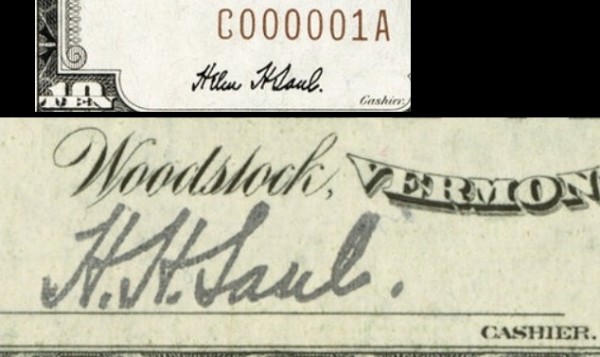 | VT | Woodstock | 1133 | Saul, Helen H. | Helen (Howes) Saul (Cashier 1918-1935) | 1918 | Signature | Woodstock National Bank |