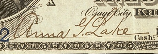 | OK | Ralston | 6232 | Henkel, Hannah | Hannah Elizabeth (Musgrove) Henkel (Cashier 1927-1930) | 1927 | Signature | First National Bank |