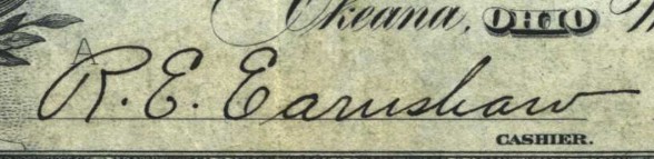 | OH | Okeana | 9450 | Earnshaw, R. E. | Mrs. Rose Eleanor (Heister) Earnshaw (Cashier 1919-1921) | 1919 | Signature | First National Bank |